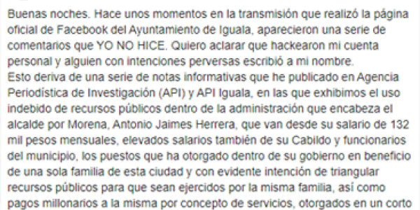 El Alcalde de Iguala y su esposa, Teresa Membrila, negaron la agresión a través de un Live en Facebook, y acusaron al periodista de querer venderles publicidad y, al no acceder, fueron hostigados.