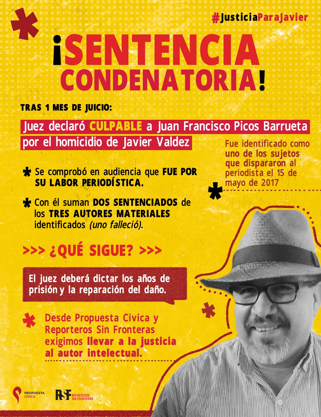 Desde Propuesta Cívica y Reporteros sin Fronteras somos conscientes que la exigencia por verdad y justicia para Javier Valdez continuará hasta que los responsables de este reprochable crimen sean enjuiciados.