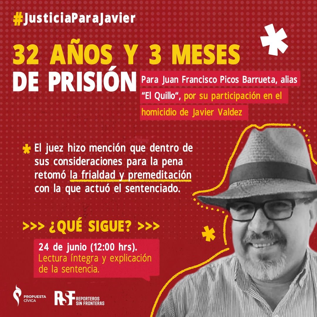 Días antes de ser asesinado a consecuencia de su periodismo de investigación el 15 de mayo de 2017, Javier Valdez afirmó, “A Miroslava la mataron por lengua larga: que nos maten a todos, si esa es la condena por reportear este infierno. No al silencio”. Hoy 8 de junio de 2021, el Juez Federal José Noé Egure Yáñez ha dictado fallo condenatorio en contra de Juan Francisco Picos Barrueta, alias El Quillo, por su participación material en el homicidio.